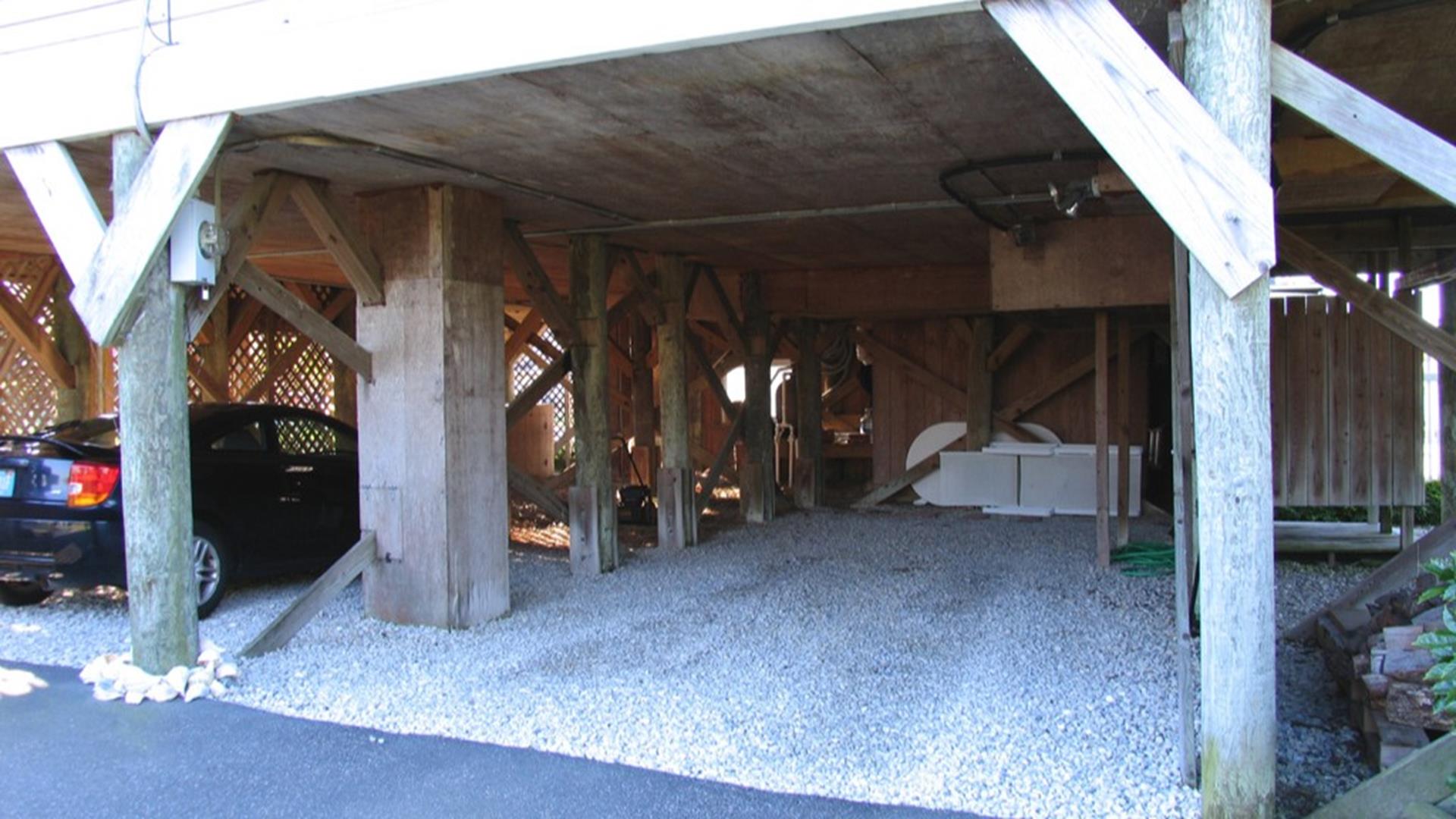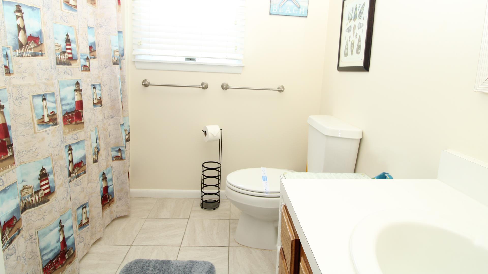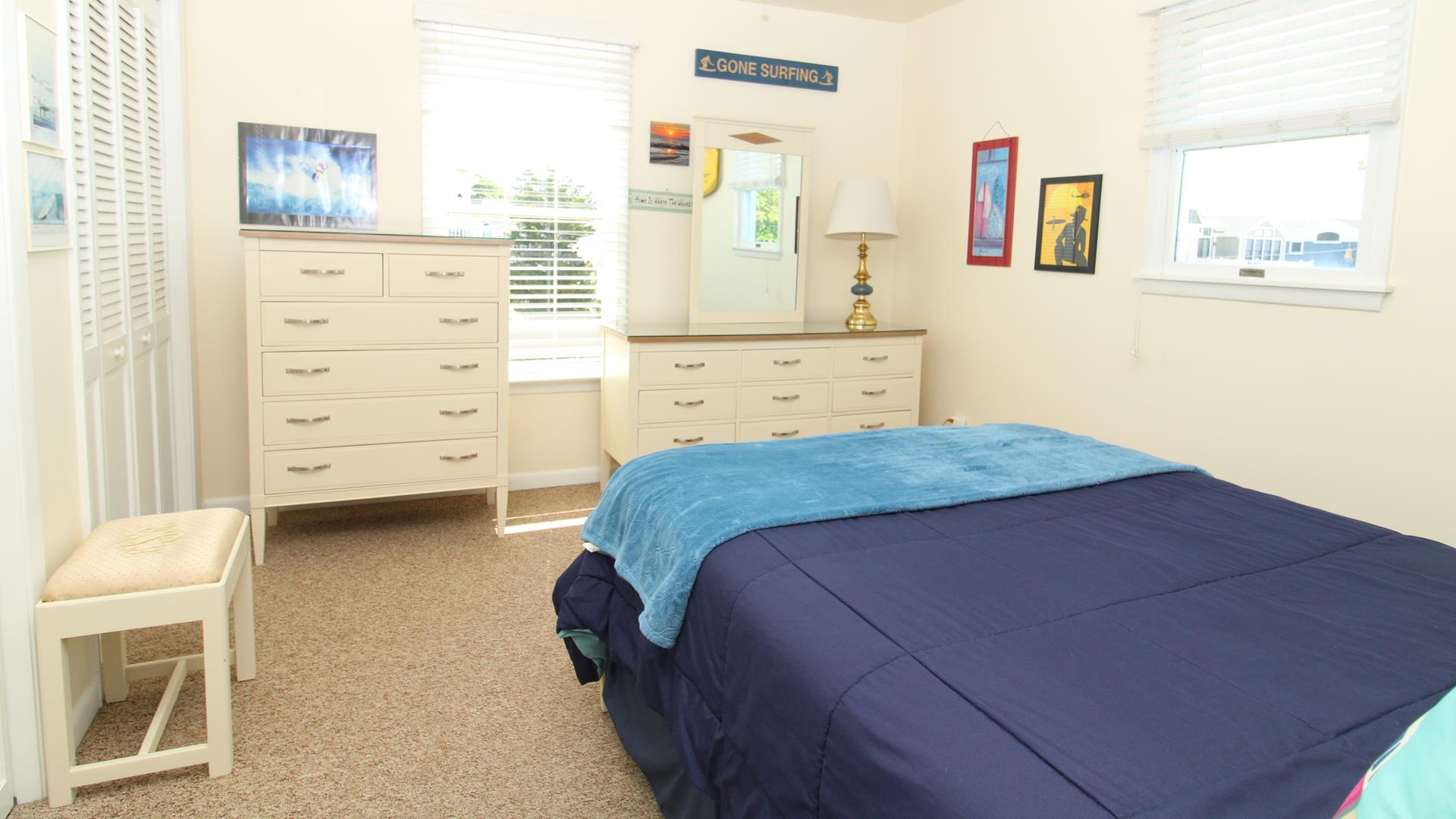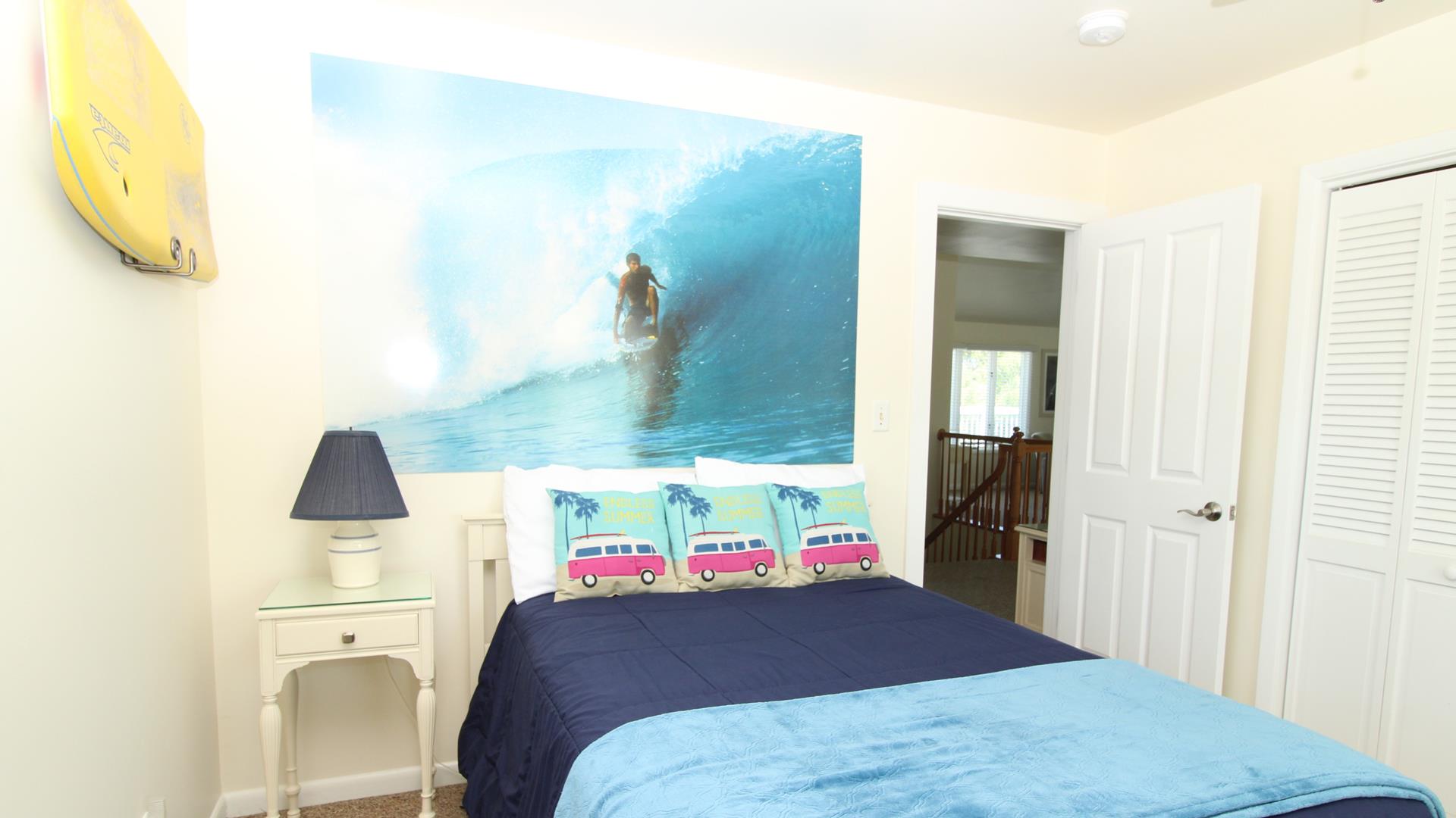 The first floor also includes a flexible full bath with stall shower that can create a private master suite for the first bedroom with a queen bed, an additional full bath, and a second bedroom with two twin beds. Upstairs, enjoy a second living area that opens to a large deck overlooking the backyard and protected Nature Conservancy area. The second floor also includes a game room style bedroom with a single daybed and TV, a king bedroom, a double bedroom with a sunny surfer theme, and a full bath.