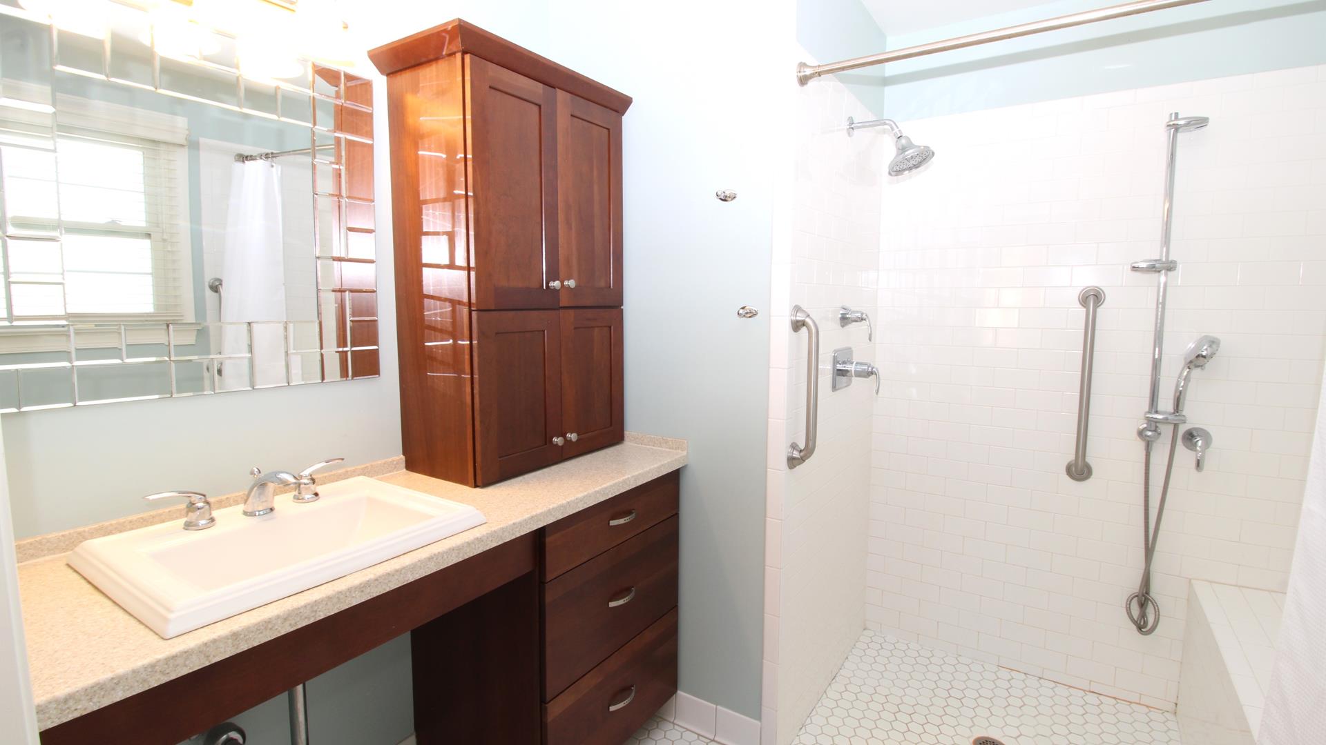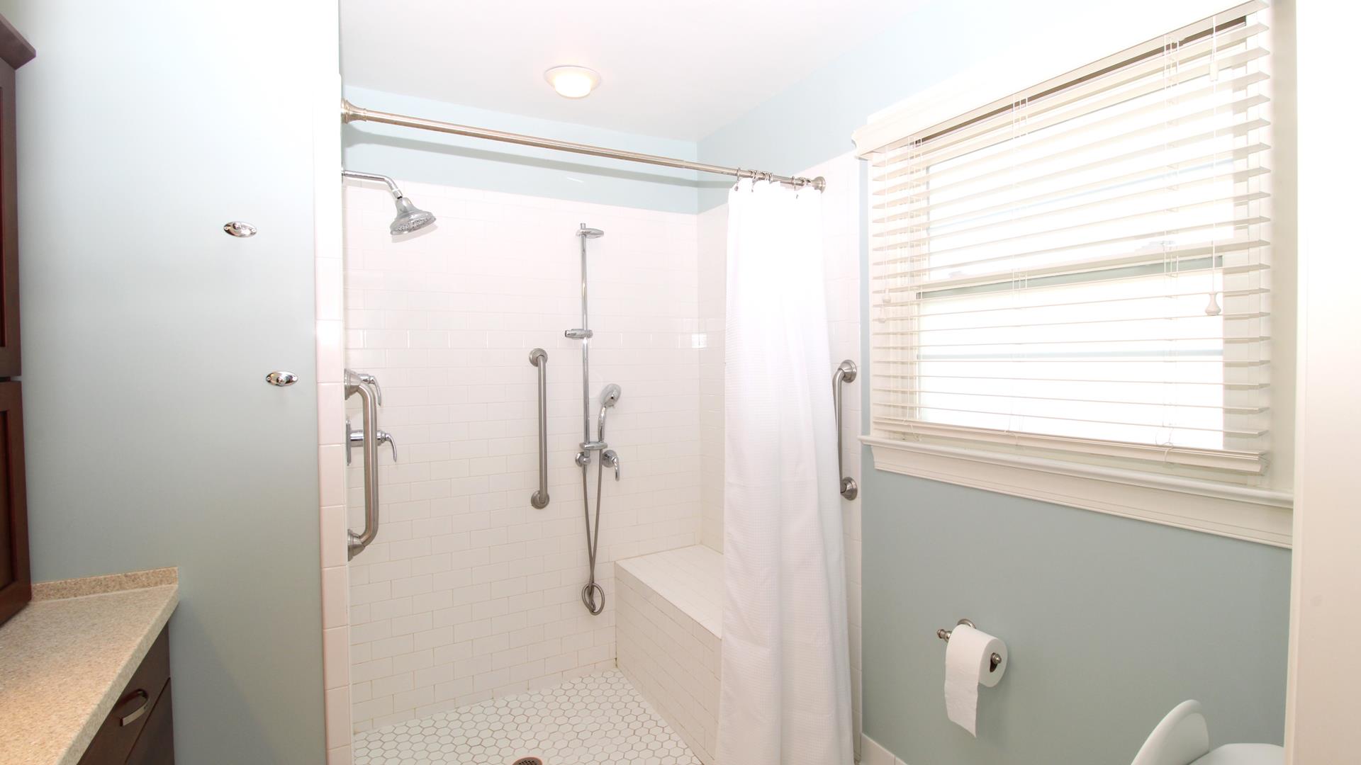 Three full bathrooms, including one with walk in shower, bench seat, and grab bars for added safety